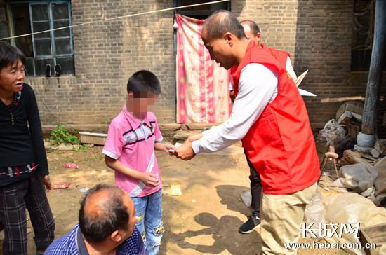 志愿者将助学金送到贫困学子手中。