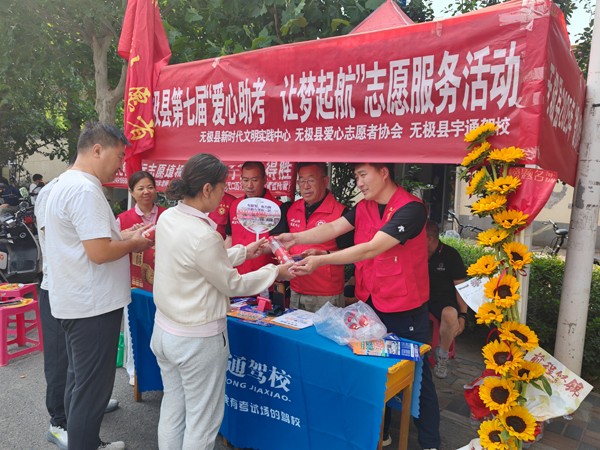 6月7日高考当天,无极县爱心志愿者协会的志愿者们积极投身“爱心助考”活动,用实际行动为考生们加油助力。考试期间,志愿者们早早来到各个考点。他们在考点周边搭建起志愿服务站,为考生和家长免费提供饮用水、扇子、文具等物品,还准备了藿香正气水、清凉油等防暑及应急药品。对于等待的家长,志愿者们主动上前交流,缓解他们的紧张情绪。